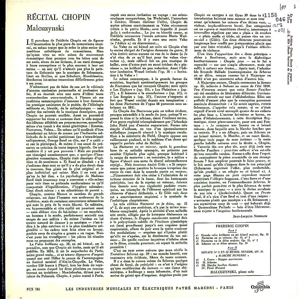 商品コード:1258-031b[COLUMBIA] W.マウツジンスキ(pf) / ショパン・レシタル/Pfソナタ2番, スケルツォ3番, 華麗なる大円舞曲, 夜想曲5番, 夜想曲13番