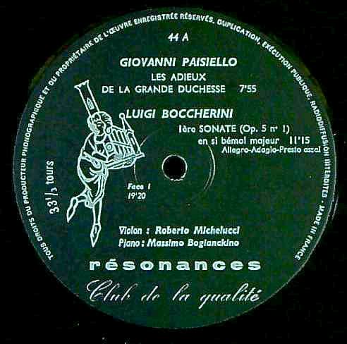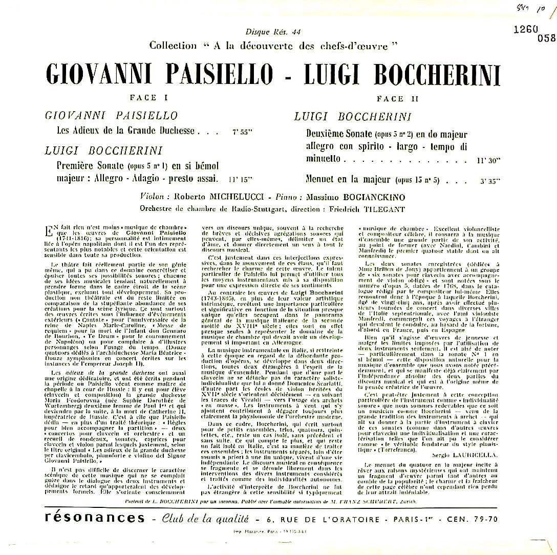 商品コード:1260-058[Résonances] R.ミケルッチ(vn) M.ボジャンキーノ(pf) F.ティーレガント指揮シュトゥットガルト放送室内o. / ボッケリーニ:VnソナタOp.5-1, Op.5-2 他, パイジェッロ