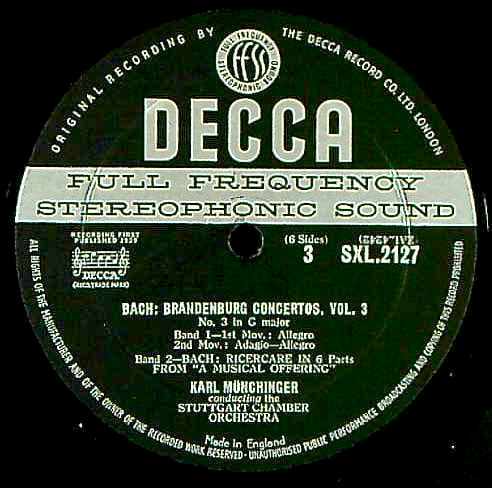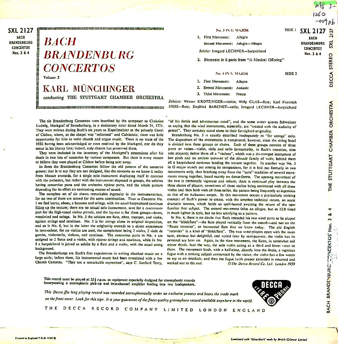 商品コード:1260-009pb[DECCA] K.ミュンヒンガー指揮シュトゥットガルト室内o. W.クロツィンガー(vn) S.バルヒェツト(vc) 他/ バッハ:ブランデンブルク協奏曲全集-3/3番B.1048, 4番B.1049