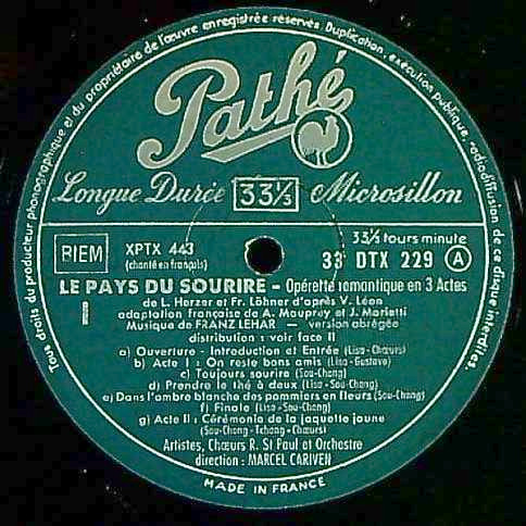 商品コード:1261-057[Pathé ] M.カリヴァン指揮ルネ・サン・ポールo. ルネ・サン・ポールcho., L.ベルトン C.コラール(s) C.デュヴォ(t) 他/ レハール:喜歌劇「ほほえみの国」(フランス語版・ハイライト)