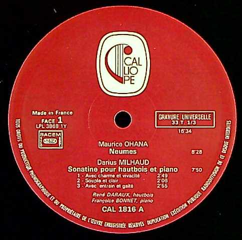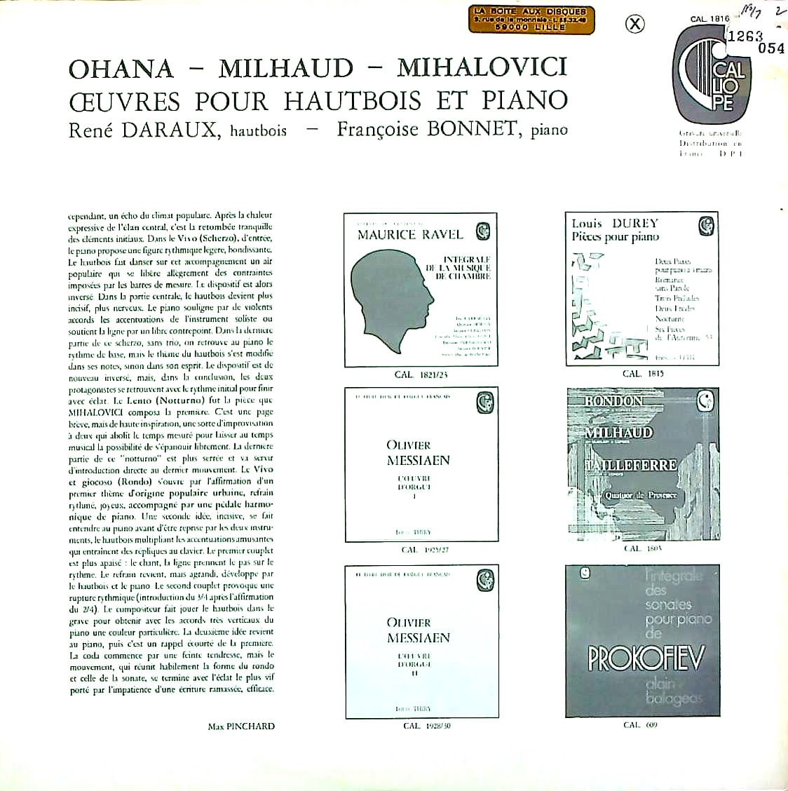 商品コード:1263-054[CALLIOPE] R.ダロー(ob) F.ボネ(pf) / フランス現代Ob作品集/オアナ:「ヌーム」, ミヨー:ソナチネ, ミハロヴィチ:「メロペイア(ソナチネ)」