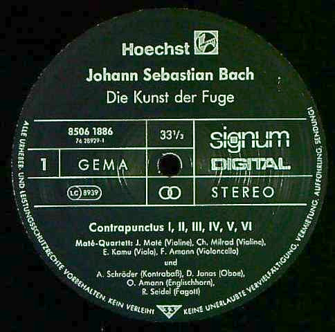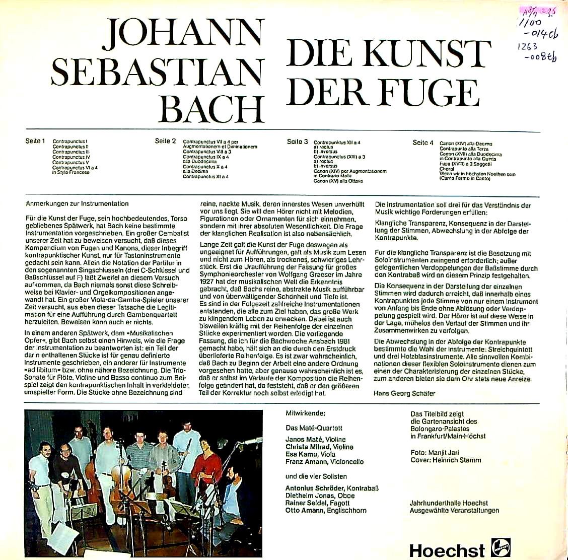商品コード:1263-008tb[HOECHST] マーテQt. A.シェーダー(cb) D.ヨナス(ob) R.ザイデル(fg) O.アマン(hr) / バッハ:フーガの技法B.1080