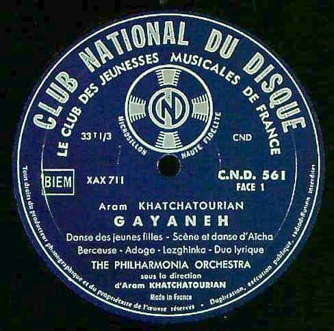 商品コード:REG-2169[仏Club National de Disques] A.ハチャトゥリアン指揮フィルハーモニアo. / ハチャトゥリアン:バレエ音楽「ガイーヌ」~8曲, 組曲「仮面舞踏会」~3曲