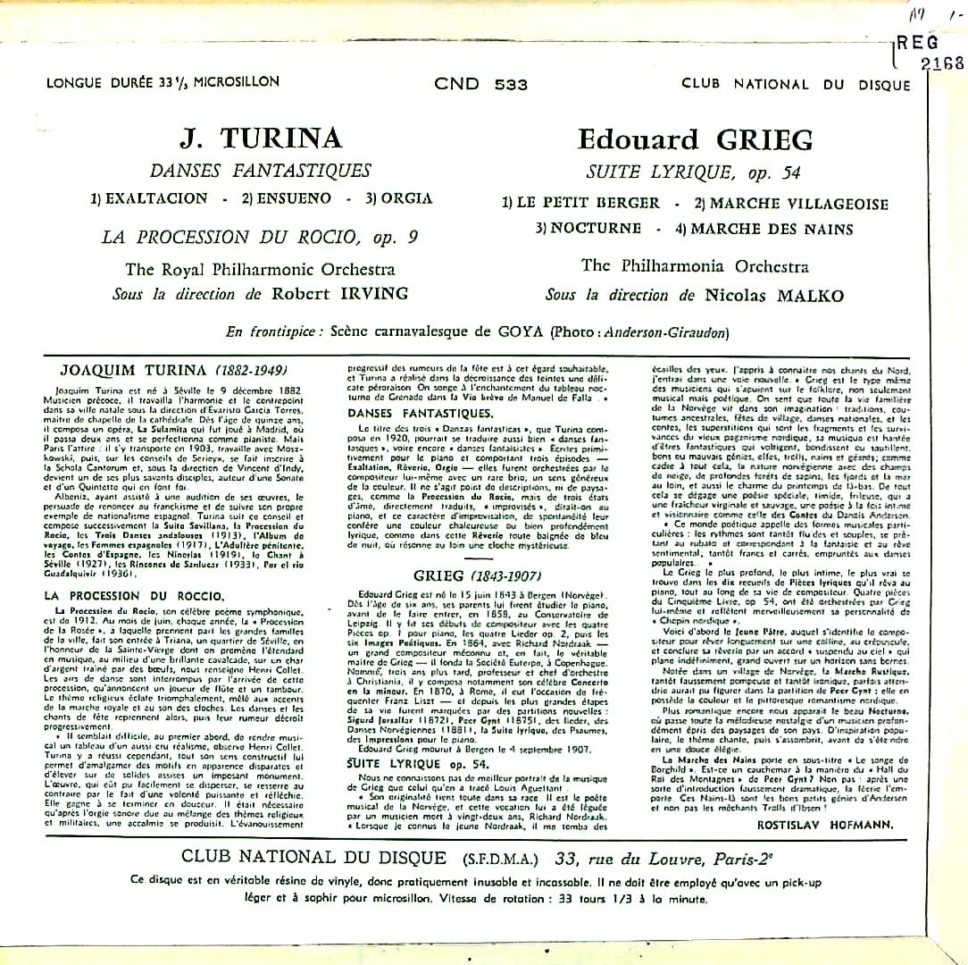 商品コード:REG-2168[仏Club National de Disques] R.アーヴィング指揮ロイヤルpo / N.マルコ指揮フィルハーモニアo. / トゥリーナ:幻想舞曲集, 交響詩「ローシオの行列」Op.9, グリーグ:抒情小品集Op.54(管弦楽版)~4曲