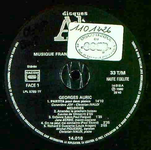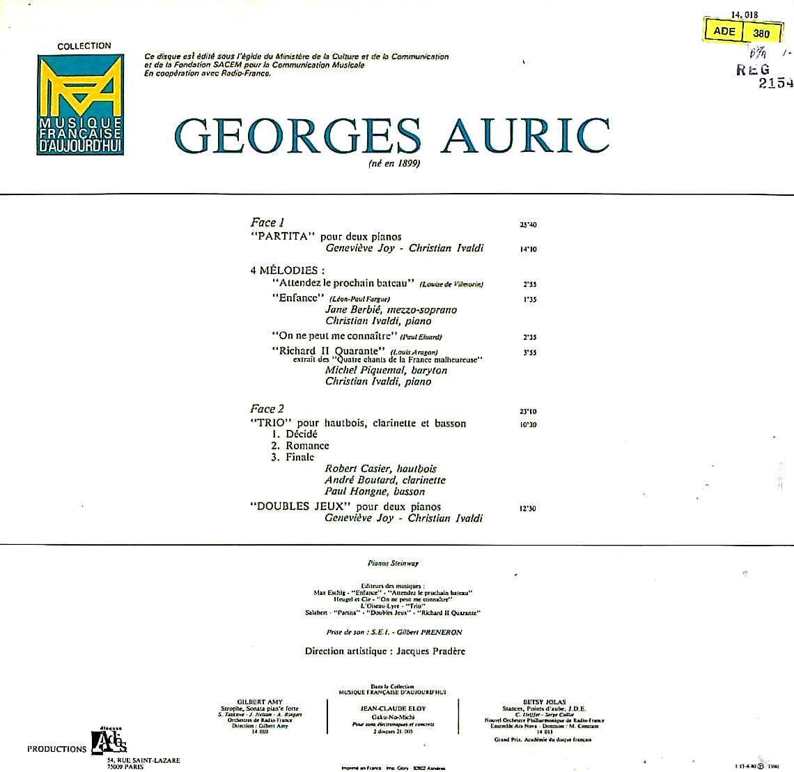 商品コード:REG-2154[仏ADÈS] G.ジョワ C.イヴァルディ(pf) J.バルビエ(ms) P.オンニュ(fg), 他 / オーリック作品集/2Pfのためのパルティータ, 管楽三重奏曲, 歌曲(4曲), 他