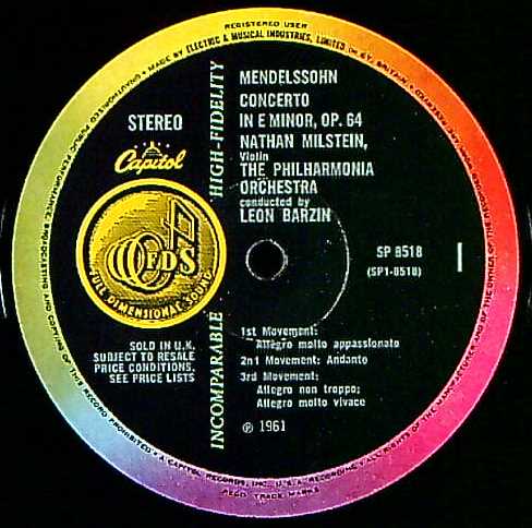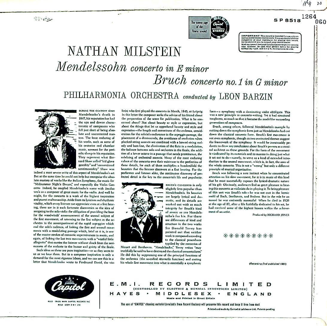 商品コード:1264-060[CAPITOL] N.ミルシテイン(vn) L .バージン指揮フィルハーモニアo. / メンデルスゾーン:Vn協奏曲Op.64, ブルッフ:Vn協奏曲1番Op.26