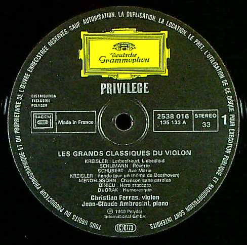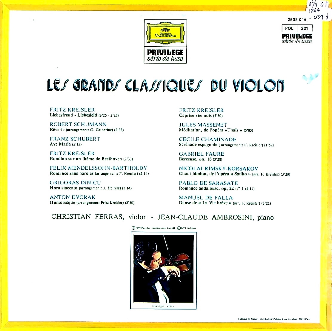 商品コード:1264-034d[DGG] C.フェラス(vn) J.C.アンブロジーニ(pf) / Vn小品集/アヴェ・マリア, トロイメライ, 愛の喜び, 愛の悲しみ, タイスの瞑想曲, ユモレスク, ホラ・スタッカート, インド人の歌 他全15曲