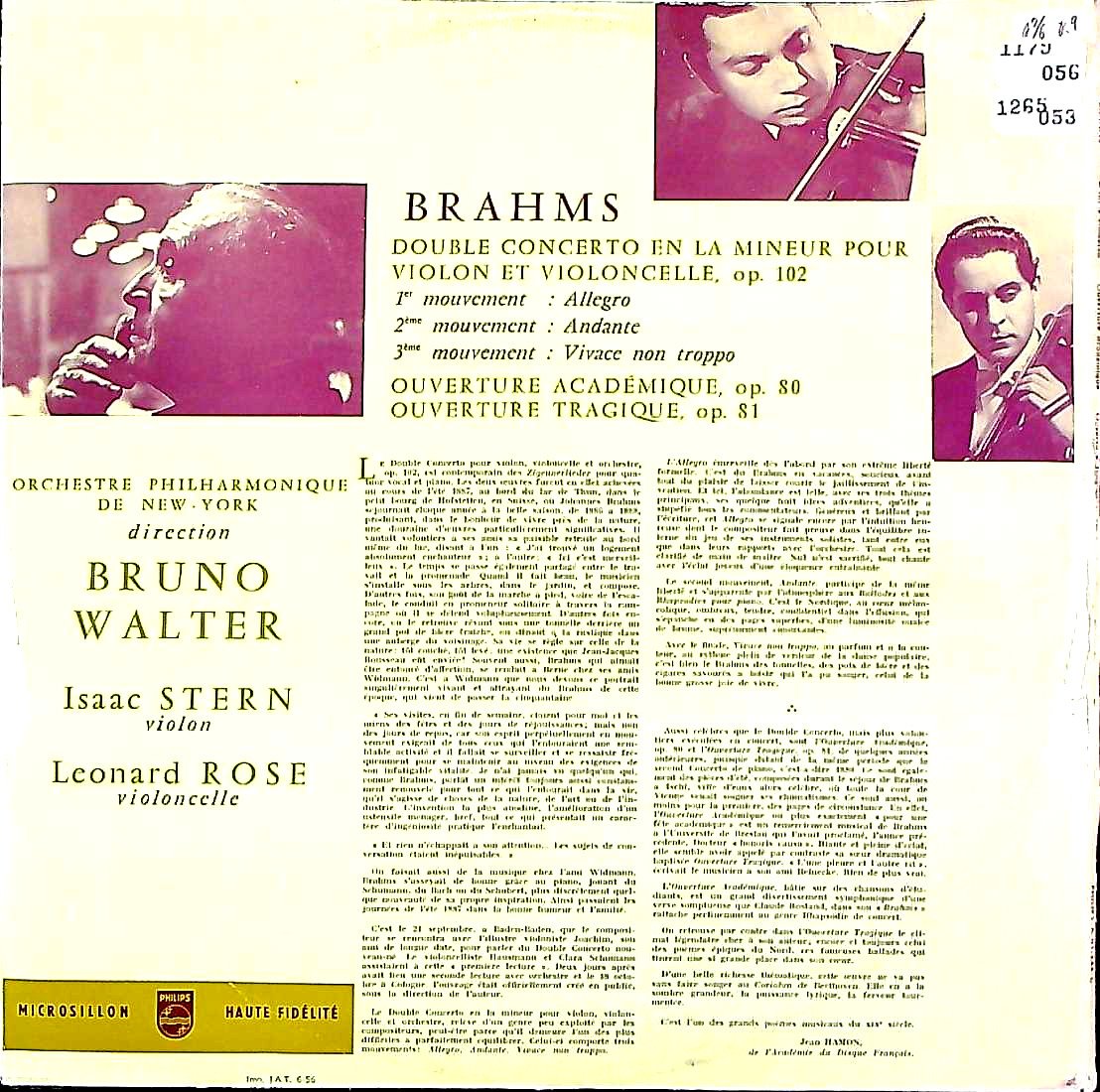 商品コード:1265-053[PHILIPS] I.スターン(vn) L.ローズ(vc) B.ワルター指揮ニューヨークpo. / ブラームス:VnとVcのための二重協奏曲Op.102, 大学祝典序曲Op.80, 悲劇的序曲Op.81