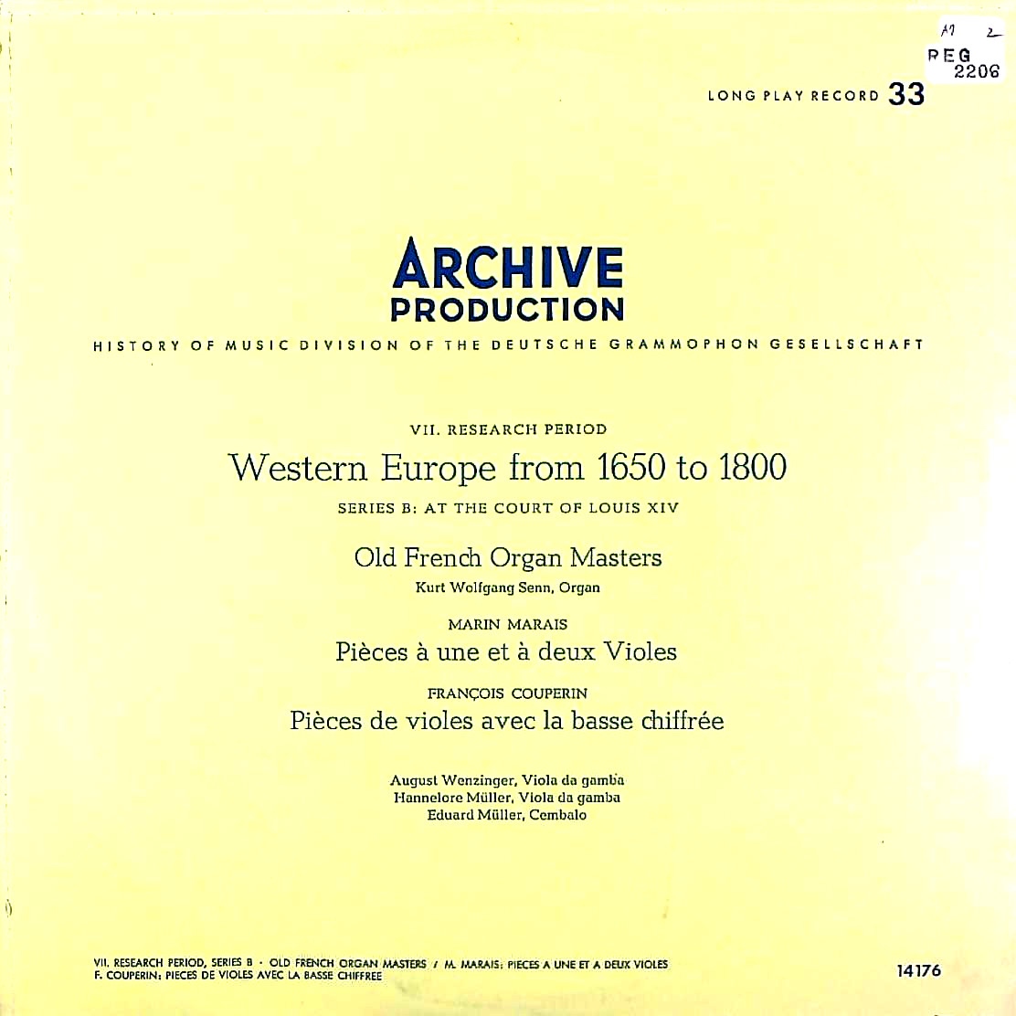 商品コード:REG-2206[独Archiv Produktion] A.ヴェンツィンガー H.ミュラー(gamb) E.ミュラー(cemb) K.W.ゼン(org) / 1650~1800年の西欧音楽・ルイ14世の宮廷/マレ, F.クープラン, 仏Orgの巨匠たち(グリニ, 他)