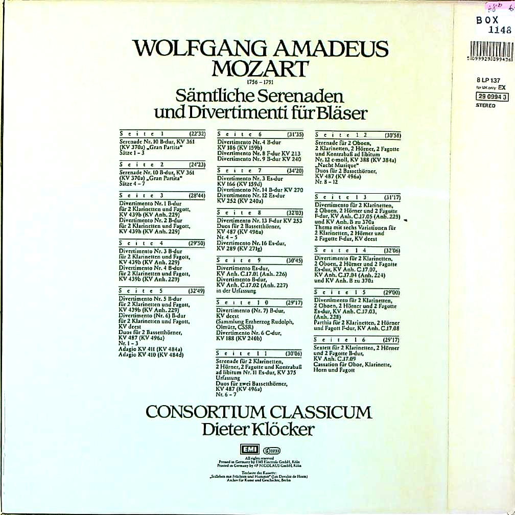 商品コード:BOX-1148t[独ELECTROLA] D.クレッカー(cl) コンソルティウム・クラシクム / モーツァルト:管楽器の為のセレナーデ・ディヴェルティメント全集