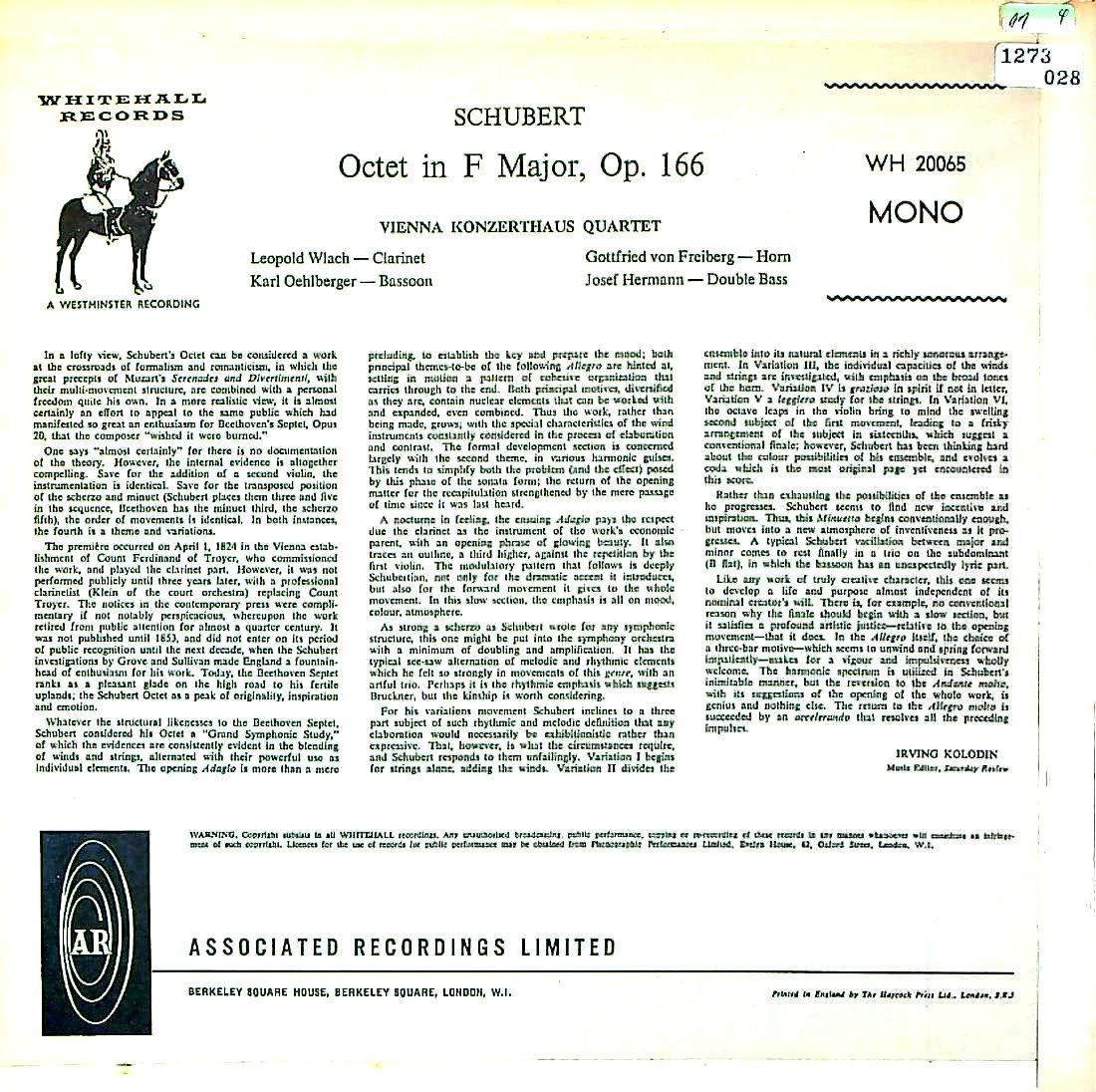 商品コード:1273-028p[WHITEHALL] L.ウラッハ(cl) K.エールベルガー(fg) G.v.フライベルク(hr) J.ヘルマン(cb) ウィーン・コンツェルトハウスQt. / シューベルト:八重奏曲Op.166