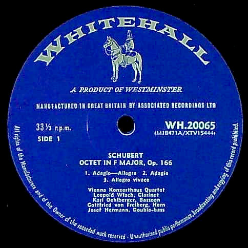 商品詳細:シューベルトの八重奏曲 ヘ長調 D803は6つの楽章から成るヘ長調の明るい作品で、シューベルトの室内楽の中では楽器編成が最も大きく、クラリネット1、ファゴット1、ホルン1、ヴァイオリン2、ヴィオラ1、チェロ1、コントラバス1で構成される。内ヴァイオリン2、ヴィオラ1、チェロ1の部分を弦楽四重奏団が担うのが通常で,ここではウィーン・コンツェルトハウスQtが担当。そこにウィーン・フィルハーモニー木管グループのメンバーであるL.ウラッハ(cl)K.エールベルガー(fg)G.v.フライベルク(hr)J.ヘルマン(cb)の4人が参加している。シューベルトの弦楽四重奏曲全集を録音しているウィーン・コンツェルトハウスQtが八重奏曲でも核を担うことが当然といえるだろう。録音は1951年頃で早い段階で予定されていたようである。WESTMINSTERとしてもシューベルトの弦楽四重奏曲の前期作品よりは編成の大きな八重奏曲は優先されたことは疑う余地はない。弦楽四重奏曲で売れるのは後期番号だからである。当時余程の通人でなければ11番以前の曲には抵抗があったに違いない。米国では1951年に WL 5094(緑/銀中溝レーベル・フラット盤)でリリースされた。その後数回にわたり再版が切り返される。それだけベストセラーLPの一つだったに違いない。英国では英NIXA:WLP 5094で初リリースされ、米国でWL番号からXWN番号に切り替わる1957年頃英WHITEHALLというレーベルに切り替わる。これはその英WHITEHALL発売分である。米国にもWHITEHALLは存在するが英国ではSAGAグループのAssociated Recordings Limitedが受け持つことになる。製造はNIXAの後継企業であるPye Records Ltd.。Pye系列でプレスされるため穏やかな音質で聴くことができる。米国プレスの音に過敏な方にはこの英WHITEHALLの音質はお勧めである。但し入荷は少ない。多くの名演が生み出された1951年のウィーン録音の一つである。内容には100%信頼を於いていただいて問題ない。