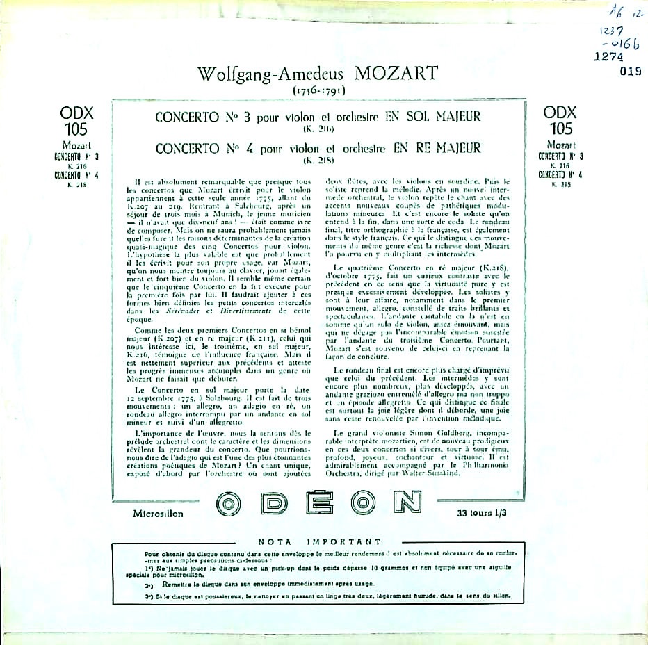 商品コード:1274-019[ODÉON] S.ゴールドベルク(vn) W.ジュスキント指揮フィルハーモニアo. / モーツァルト:Vn協奏曲3番K.216, Vn協奏曲4番K.218