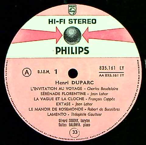 商品コード:1275-049[PHILIPS] G.スゼー(br) D.ボールドウィン(pf) / デュパルク:歌曲集 全12曲