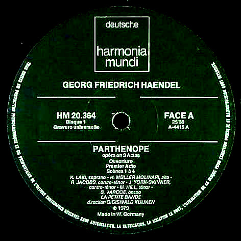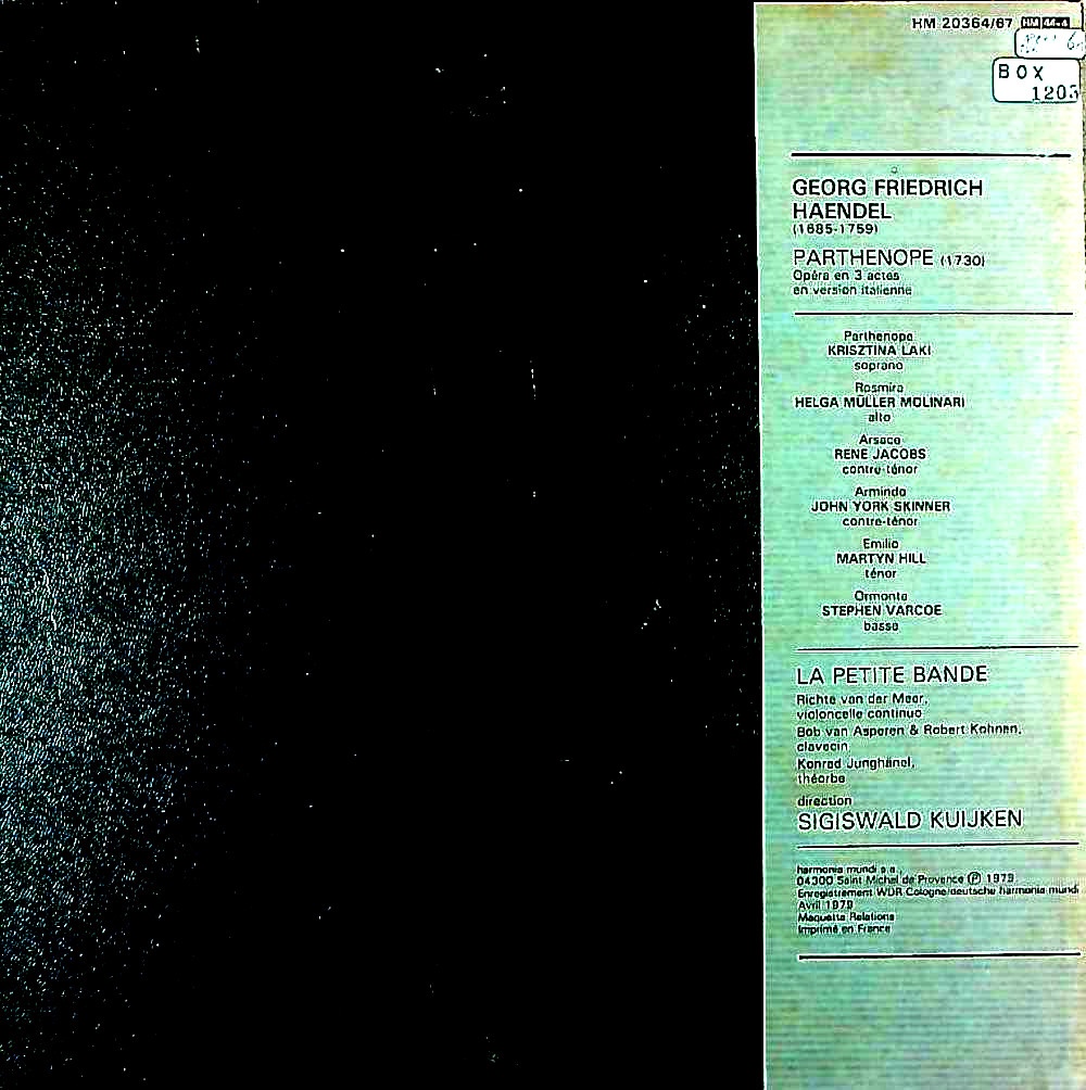 商品コード:BOX-1203[仏Harmonia Mundi] S.クイケン指揮ラ・プティ・バンド, K.ラキ(s) H.M.モリナーリ(a) R.ヤーコプス(ct)他 / ヘンデル:歌劇「パルテノ-ペ」(全曲)