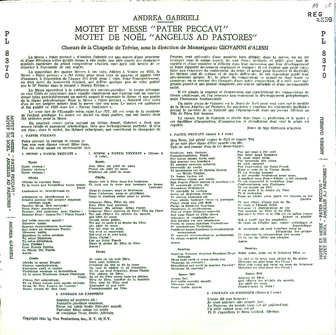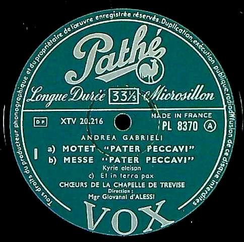 商品コード:REG-2359[仏Pathé-VOX] G.アレッシ指揮トレヴィーゾ教会cho. / A.ガブリエーリ:モテットとミサ「父よ、われらは天に対し」, クリスマスモテット「天使は羊飼いに言った」