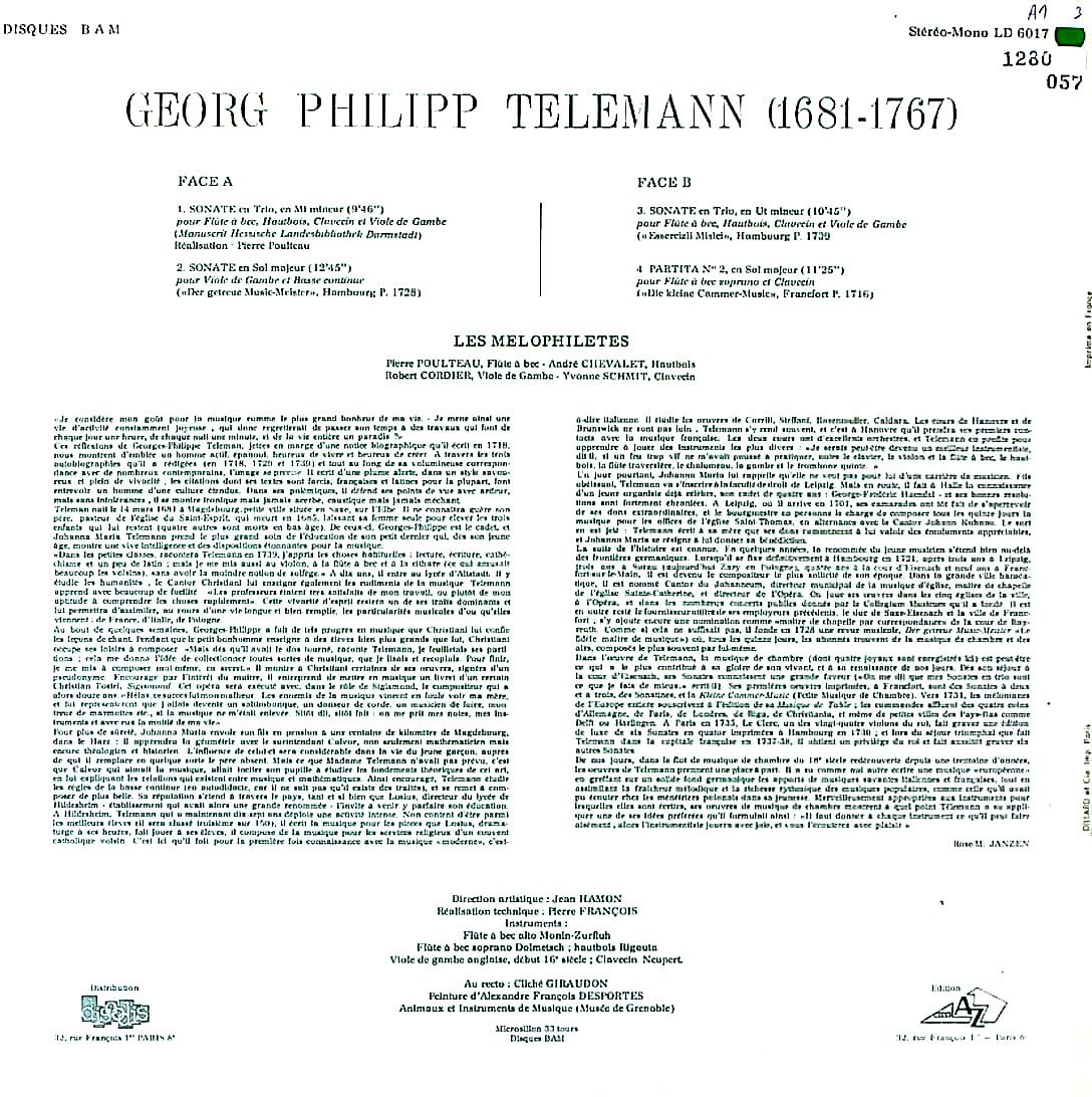 商品コード:1280-057[BAM] メロフィルテ P.プルトー(fl) A.シュヴァレ(ob) R.コルディエ(gamb) Y.シュミット(cemb) / テレマン:トリオ・ソナタ(3曲), パルティータ