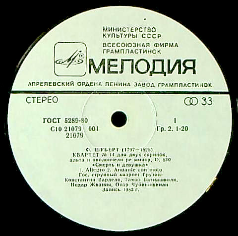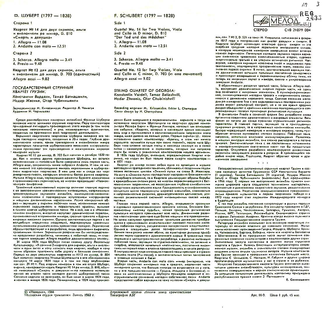 商品コード:REG-2435[露MELODIYA] グルジアQt. / シューベルト:SQ14番「死と乙女」D.810, 12番「四重奏断章」D.703