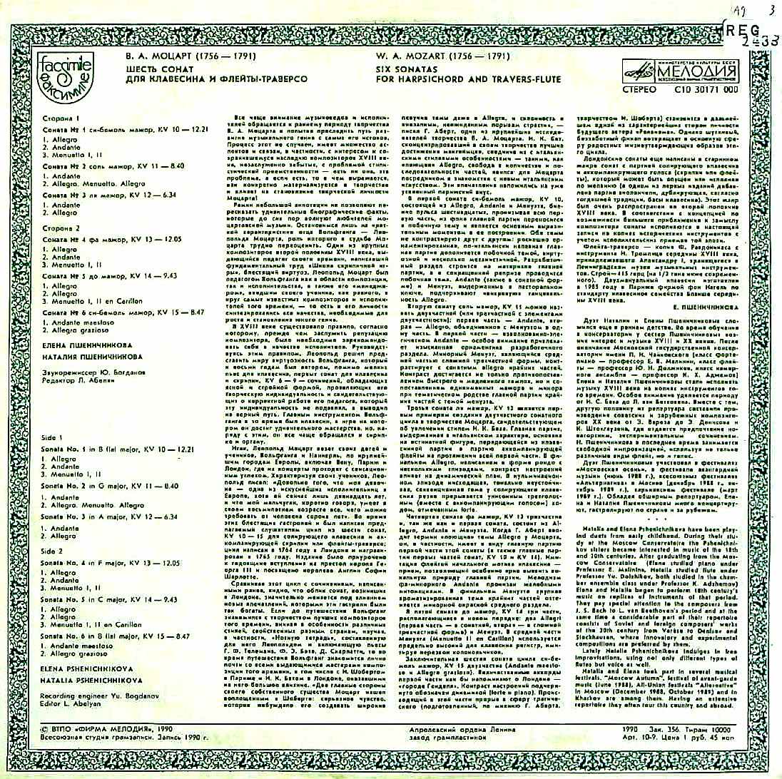 商品コード:REG-2433[露MELODIYA] N.プシェニツニコワ(fl) E.プシェニツニコワ(cemb) / モーツァルト:FlソナタK.10~15(全6曲)