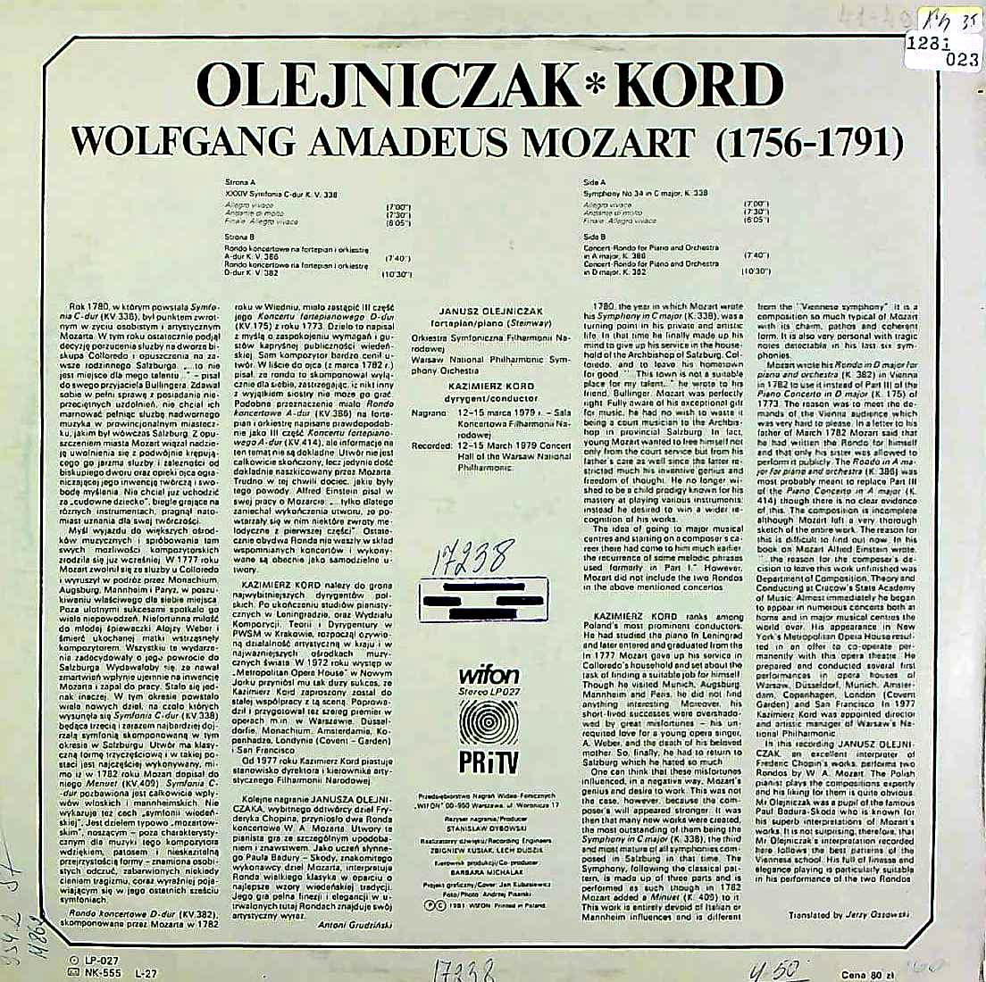 商品コード:1281-023n[WIFON] J.オレイニチャク(pf) K.コルト指揮ワルシャワ国立po. / モーツァルト:交響曲34番K.338, Pfと管弦楽のためのロンドK.382, 386
