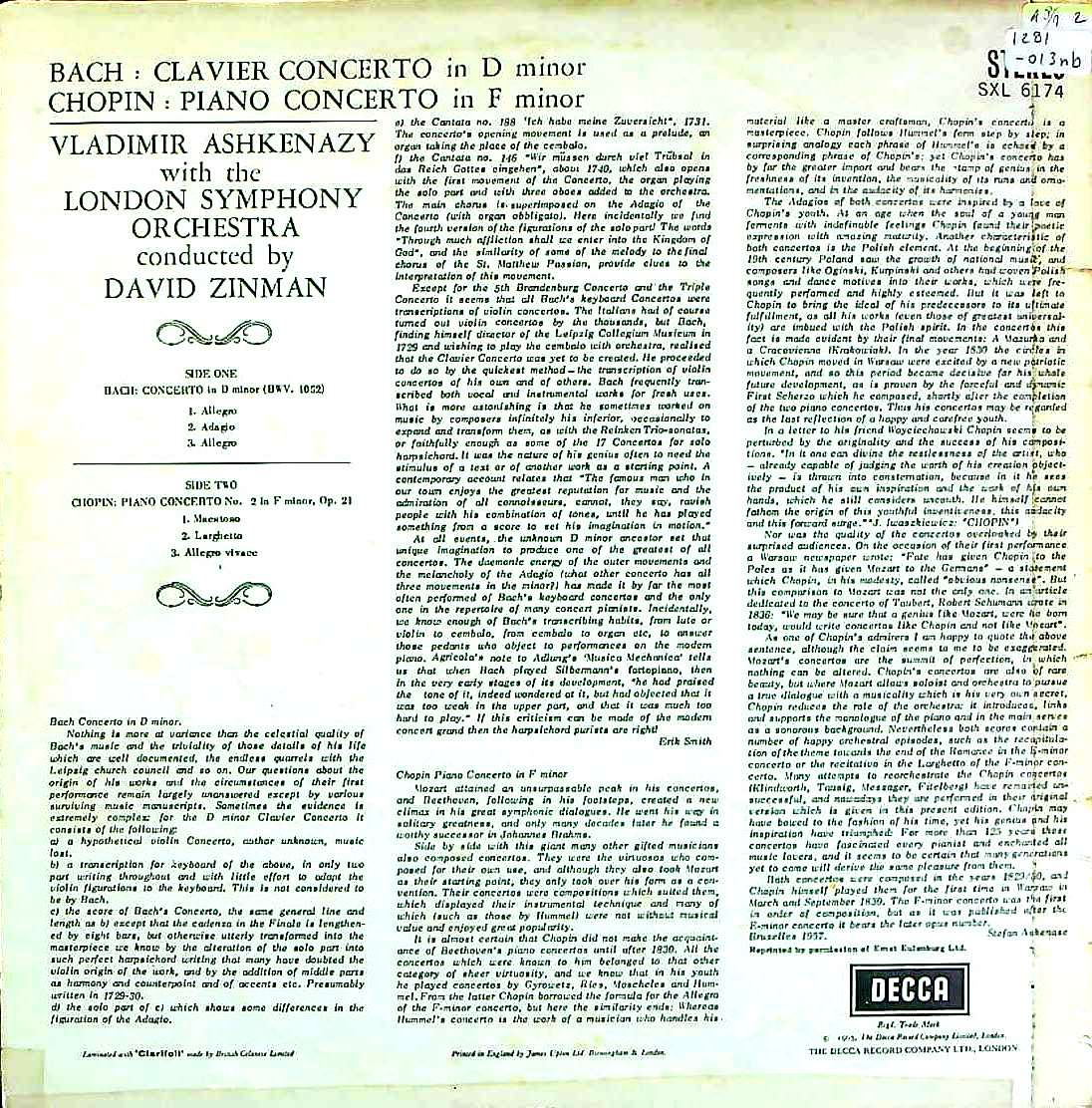 商品コード:1281-013nb[DECCA] V.アシュケナージ(pf) D.ジンマン指揮ロンドンso. / バッハ:Pf協奏曲1番B.1052, ショパン:Pf協奏曲2番Op.21