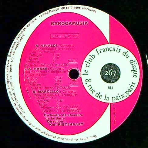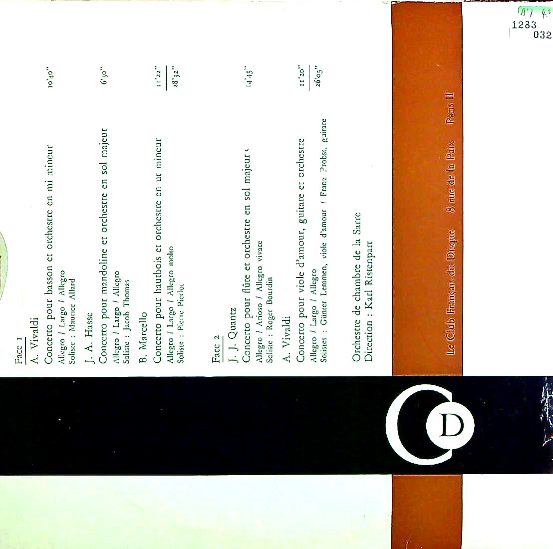 商品コード:1283-032p[Le Club Français Du Disque] K.リステンパルト指揮ザール室内o. M.アラール(fg) 他/ 「イタリア・バロック協奏曲集」ヴィヴァルディ(2曲), ハッセ, B.マルチェッロ, クヴァンツ