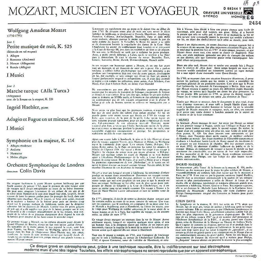 商品コード:REG-2484[欧PHILIPS] イ・ムジチ(K.525) I.ヘブラー(pf) C.デイヴィス指揮ロンドンso.(K.114) / モーツァルト:アイネ・クライネ・ナハトムジークK.525, トルコ行進曲, アダージョとフーガK.546, 交響曲K.114