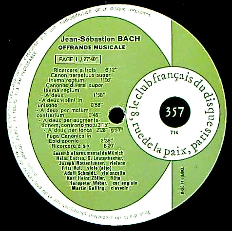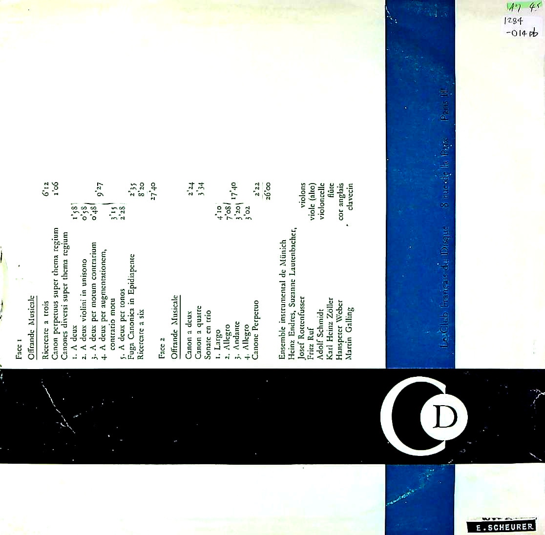 商品コード:1284-014pb[Le Club Français Du Disque] ミュンヘン器楽Ens.(H.エンドレス, S.ラウテンバッハー, J.ロッテンフッサー(vn) F.ルッフ(va) A.シュミット(vc) K.H.ツェラー(fl) 他)/ バッハ:音楽の捧げ物B.1079