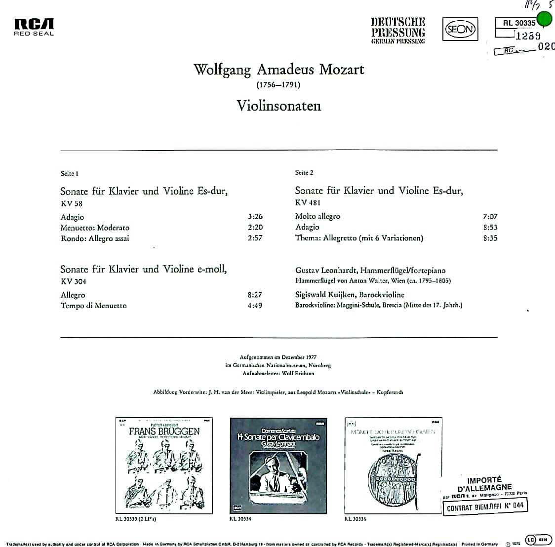 商品コード:1289-020[RCA] S.クイケン(バロックvn) G.レオンハルト(hf) / モーツァルト:VnソナタK.58, K.304, K.481