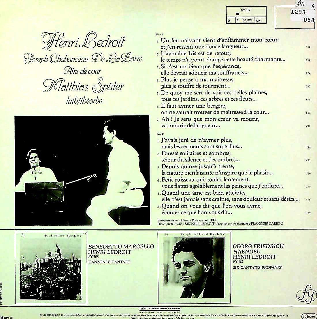 商品詳細:フランスのカウンター・テナー歌手アンリ・ルドワがリュート伴奏でフランスの作曲家ジョゼフ・シャバンソー・ド・ラ・バール(Joseph Chabanceau de La Barre) (1633-1678)の歌曲を歌うLPである。ラ・バールは特にエア・ド・クールの作曲家であった。エア・ド・クールとはルネサンス後期からバロック初期にかけて、1570 年頃から 1650 年頃まで、フランスで人気のある世俗的な声楽曲である。ルイ 13 世の治世、1610 年頃から 1635 年頃まで、これは世俗的な声楽の主流の形式であった。フランス、特に宮廷における声楽作曲。エア・ド・クールの影響はフランスを越えてドイツ、英国にまで広がった。これらの曲の雰囲気はイギリスのリュート曲とは大きく異なり、リュートの奏法にも斬新な特徴がいくつか使われている。ラ・バールはエア・ド・クールの代表的な作曲家の一人。レコードにもAirs De Courと記載されている。マティアス・シュペターのリュートとテオルボによる伴奏で13曲をタップリと歌い上げる。アンリ・ルドワは劇性を狙わずに淡々と静かに語るがごとく歌い、聴いていて疲れない。むしろ力が抜けてゆく脱力系のカウンター・テナー歌手である。英国にも似たような曲種があるが、どうやら英国とフランスとではかなり雰囲気が異なる。まず言語がフランス語であるという点。アンリ・ルドワ( 1946 — 1988)はフランス・ナンシーの生まれ。1972年にバリトンになるために訓練を受けていた彼は、アルフレッド・デラーに出会い、カウンターテナーとして訓練することに決めたという。マルク アントワーヌ シャルパンティエの「オルフェの末裔」の録音で一躍有名になった。1988 年にエイズの合併症により 52 歳で亡くなった。フランスでは名と馳せたカウンター・テナー歌手だった。静かな語り口になごみを感じる。