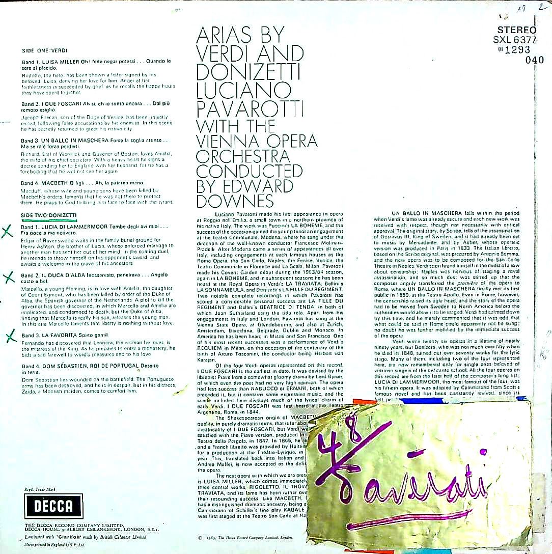 商品コード:1293-040[DECCA] L.パヴァロッティ(t) E.ダウンズ指揮ウィーン歌劇場o. / オペラアリア集/ルイーザ・ミラー, 二人のフォスカリ, 仮面舞踏会, マクベス, ランメルモールのルチーア 他