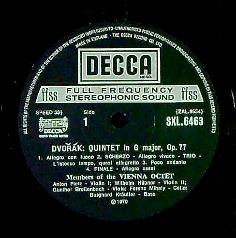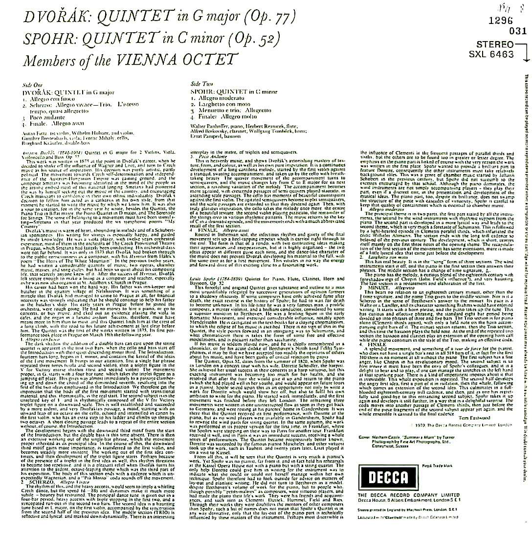 商品コード:1296-031[DECCA] ウィーン八重奏団メンバー /W.パンフォーファー(pf) H.レズニチェク(fl) A.ボスコフスキー(cl) 他/ ドヴォルザーク:弦楽五重奏曲2番Op.77, シュポーア:Pf五重奏曲Op.52