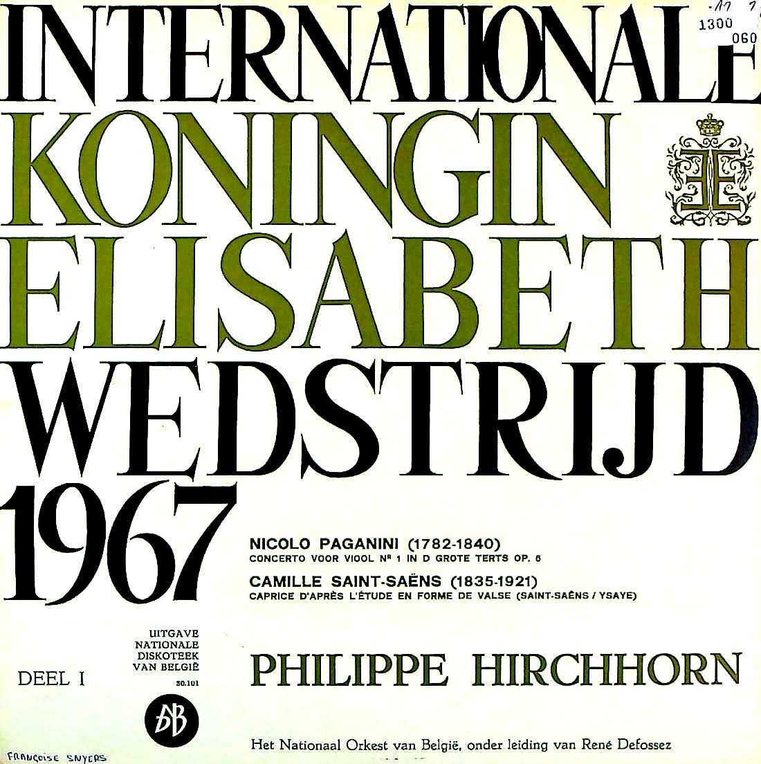商品コード:1300-060[Discothèque Nationale de Belgique] P.ヒルシュホルン(vn) R.デフォセス指揮ベルギー国立o. / 1967年エリザベート王妃国際音楽コンクール(ヴァイオリン部門優勝)