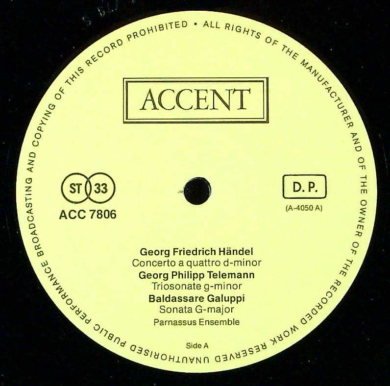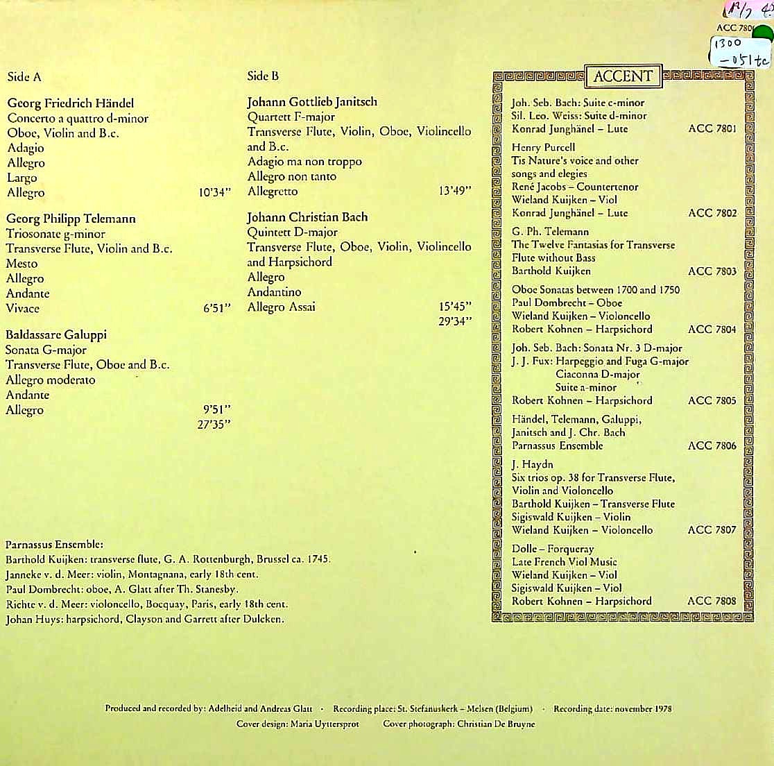 商品コード:1300-051tc[ACCENT] パルナッススEns.(B.クイケン(fl) J.v.d.メール(vn) P.ドンブレヒト(ob) R.v.d.メール(vc) J.ハイス(cemb)) / ヘンデル:4声の協奏曲, テレマン, ガルッピ ヤーニチュ, J.C.バッハ