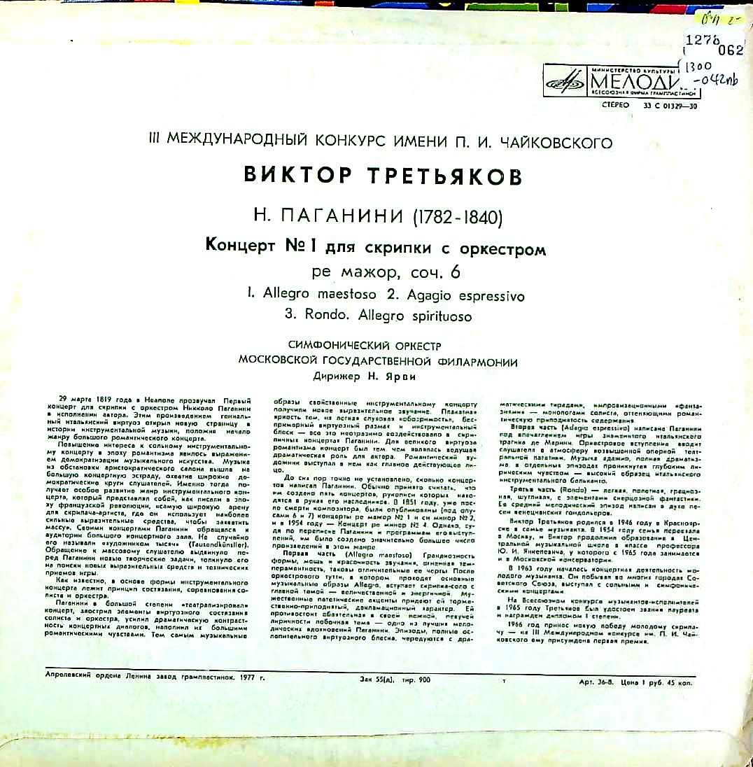 商品コード:1300-042nb[MELODIYA] V.トレチャコフ(vn) N.ヤルヴィ指揮モスクワpo. / チャイコフスキーコンクール・1966・優勝記念録音/パガニーニ:Vn協奏曲1番Op.6