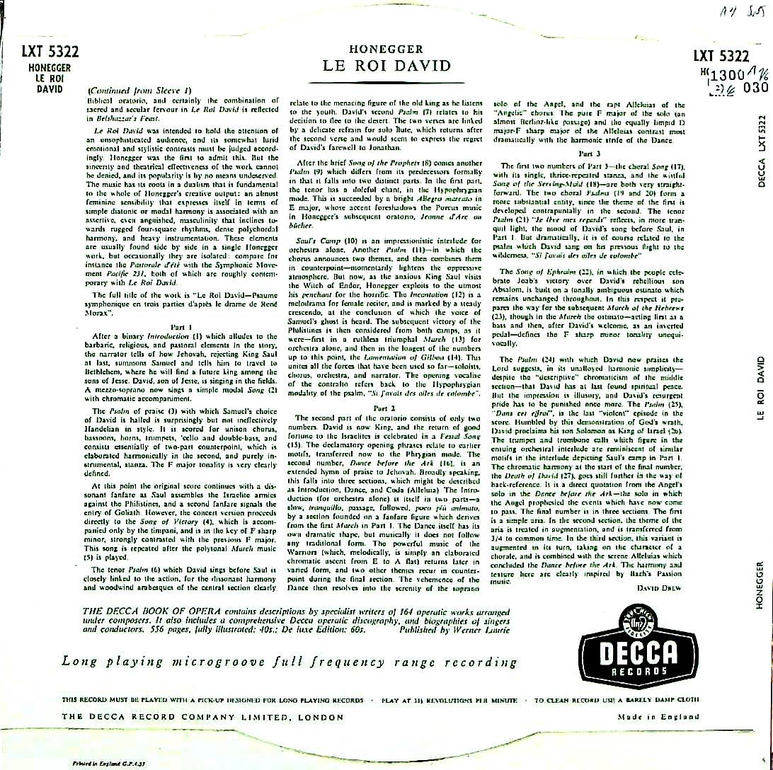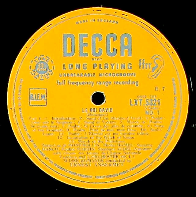 商品コード:1300-030[DECCA] E.アンセルメ指揮スイス・ロマンドo. ヴォー国民教会青少年cho. S.ダンコ(s) M.L.d.モンモラン(ms) 他/ オネゲル:交響的詩篇「ダヴィデ王」, ストラヴィンスキー:組曲「兵士の物語」