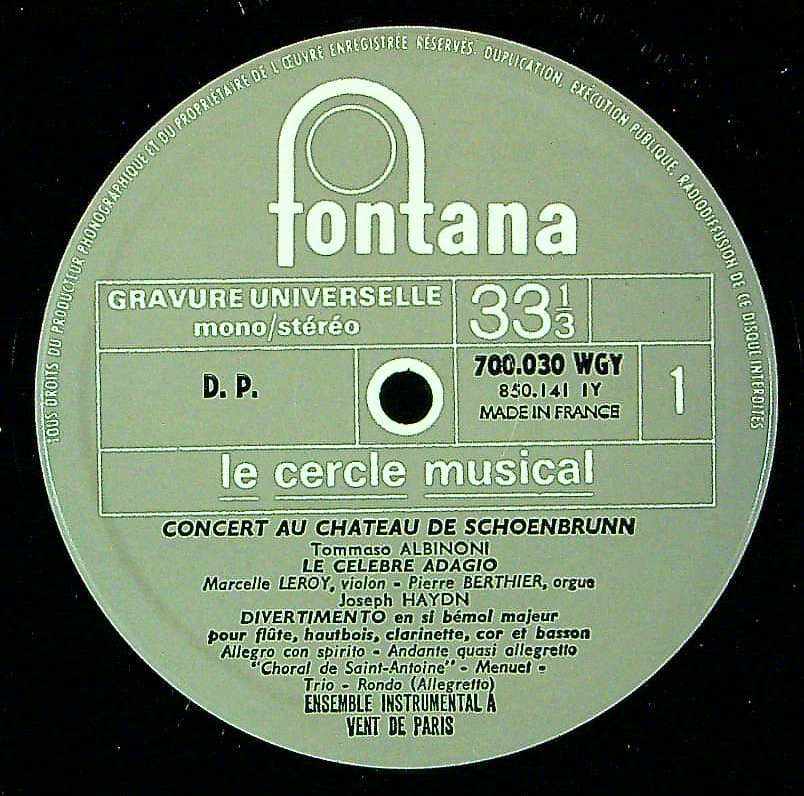 商品コード:REG-2816[仏FONTANA] P.ベルティエ(org) M.リロイ(vn)/パリ管楽器Ens. 他 / 「シェーンブルン城でのコンサート」/アルビノーニ:アダージョ(ジャゾット真作), ハイドン, ヴィヴァルディ, L.モーツァルト