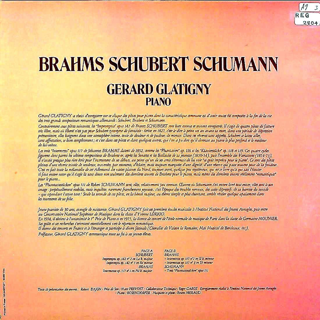 商品コード:REG-2804[仏プライベート] G.グラティニー(pf) / シューベルト:即興曲Op.142-1, 2, ブラームス:3つの間奏曲Op.117, シューマン:3つの幻想的小曲Op.111