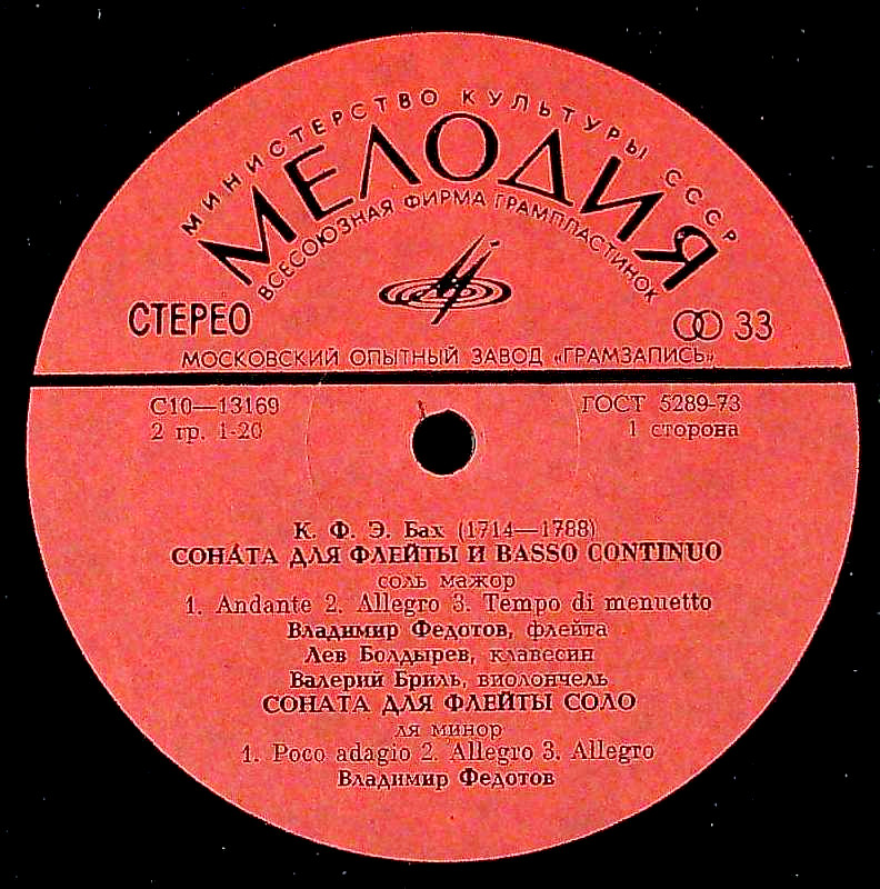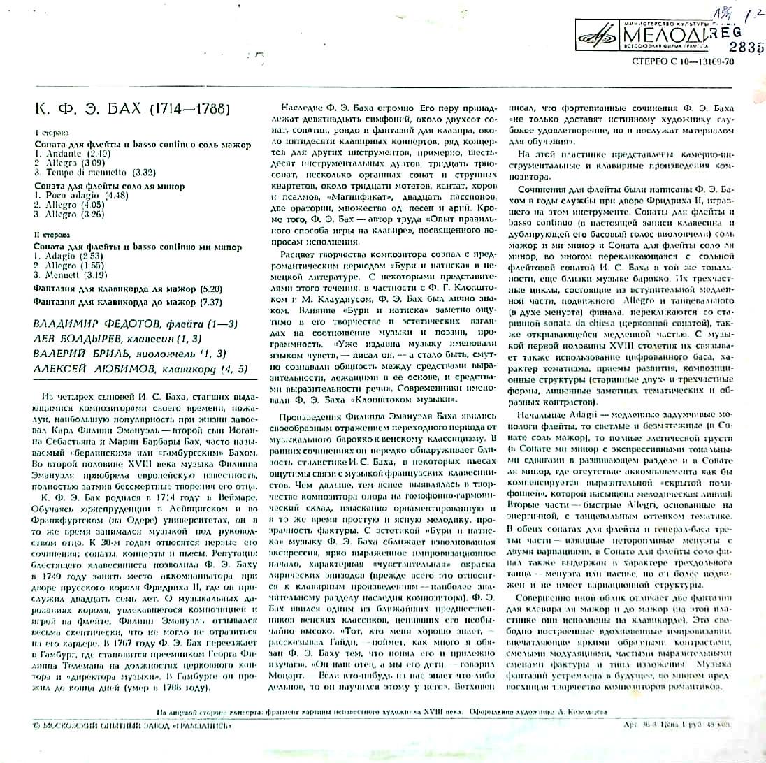 商品コード:REG-2835[露MELODIYA] V.フェドトフ(fl) B.ブリル(va) L.ボルディレフ(cemb) A.リュビモフ(クラヴィコード) / C.P.E.バッハ:Flソナタ ト長調, 無伴奏Flソナタ ロ短調, Flソナタ ホ短調 他
