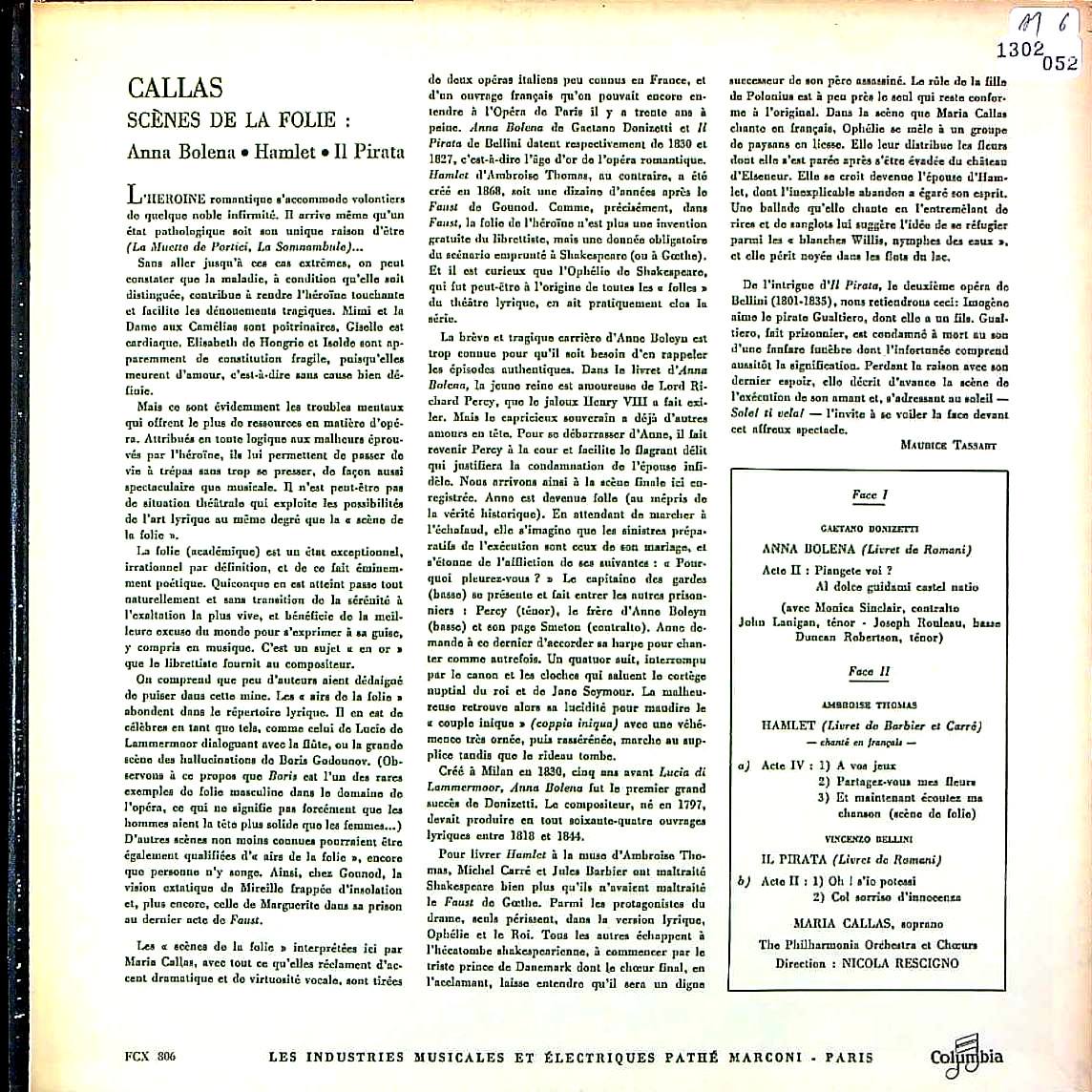 商品コード:1302-052[COLUMBIA] M.カラス(s) N.レッシーニョ指揮フィルハーモニアo.cho. M.シンクレア(ca) J.ラニガン, D.ロバートソン(t) J.ルルー(bs) / 「狂乱の場」ドニゼッティ トマ, ベッリーニ