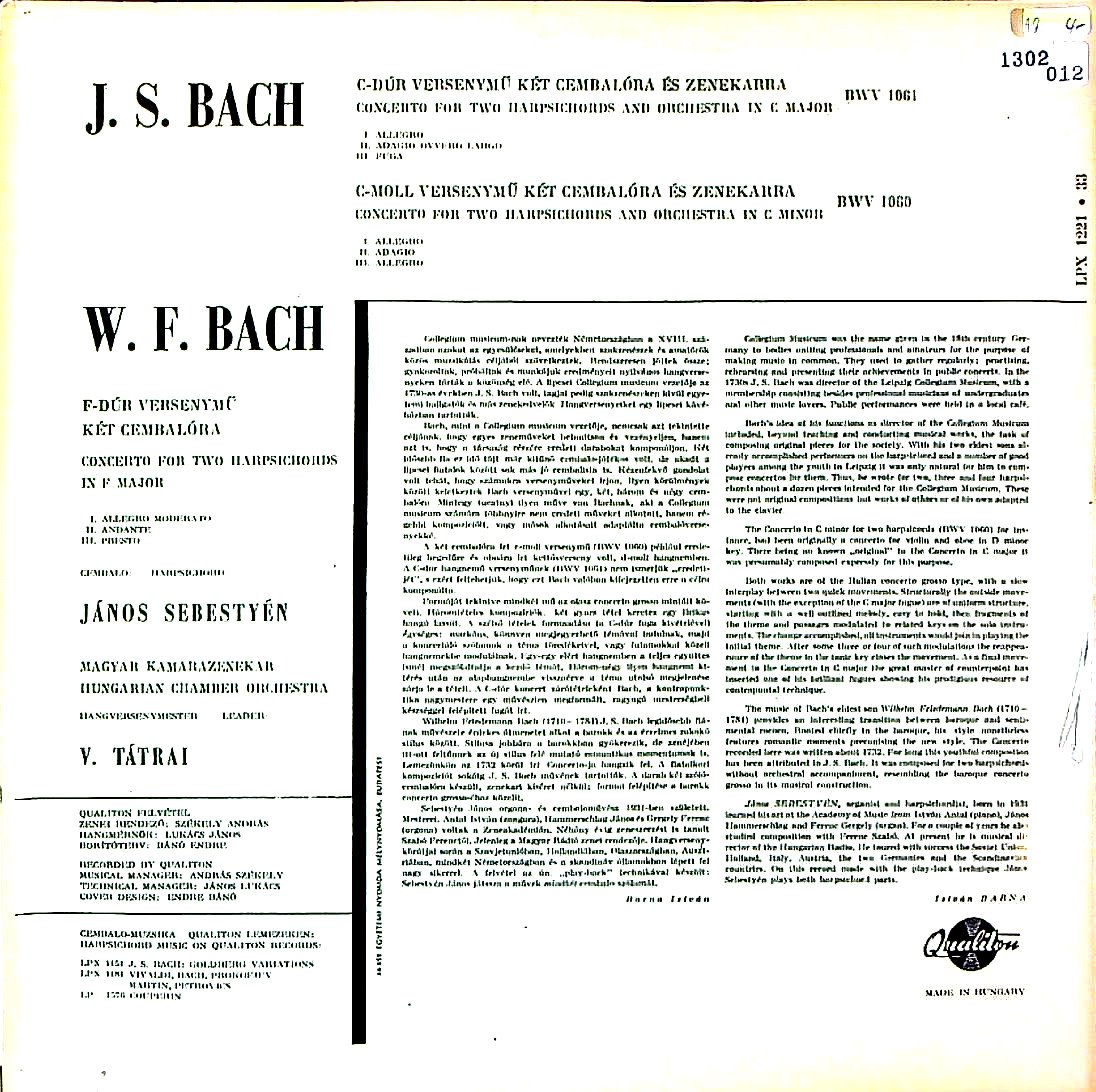 商品コード:1302-012n[QUALITON] J.シェベシュティエン(cemb) V.タートライ指揮ハンガリー室内o. / バッハ:2Cemb協奏曲B.1060, 2Cemb協奏曲B.1061, W.F.バッハ:2Cemb協奏曲