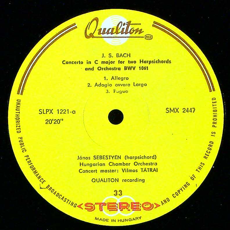 商品詳細:Qualitonの最初期ステレオなので、大変音質が良い。A面にB.1061、B面2/3にB.1060、残り1/3がW.F.バッハの2台Cemb協。J.S.バッハの2曲入りと考えて差し支えない。ゆっくりしたテンポ、きびきびしたオケときらきらと輝くようなCembの音はクリアーで大きい。あまり注目されるLPではないが、内容は大変優れている。ソロがとても明瞭で、ニュアンスも伝わる。西側に比べ、軽んじられる傾向にある東欧レーベルだが、その内容は勝るものが多い。バッハ好きに是非!曲は全て2台チェンバロ用だが、チェンバロ奏者はJ.シェベシュティエン(János Sebestyén)一人だけであり、シェベシュティエンが多重録音で両パートを演奏した珍しいハンガリー録音である。録音の鮮度は高く、チェンバロがぐんぐんと前に張り出し、オケとのバランスは完璧である。指揮はハンガリーの重鎮ヴィルモス・タートライである。全体がリズム感で満ちていて心よい刺激が包む。西側にも負けない高音質録音である。チェンバロのソロは当然だが、何よりタートライ/ハンガリー室内o.の乗りが見事。それだけでもバッハの厳格かつ音楽的な高揚が得られる。加えて録音技術の進歩か?2パートのソロはまるで2人で同時演奏しているのと変わらないプレゼンスを見せる。よく出来たバッハチェンバロ協奏曲集である。オリジナル・ステレオの黄/茶ツヤ<33白〇〇ダブルレター赤STEREO>レーベルの音質は本当のステレオ・オーディオファイルプレス!