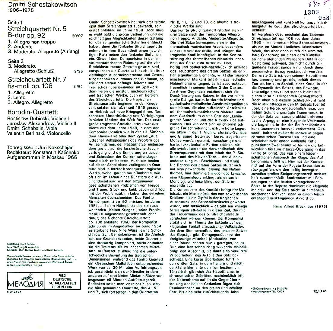 商品コード:1303-058t[ETERNA] ボロディンQt./ ショスタコーヴィチ:弦楽四重奏曲5番Op.92, 弦楽四重奏曲7番Op.108