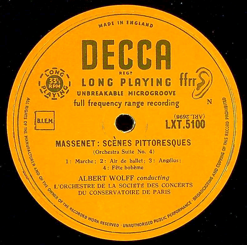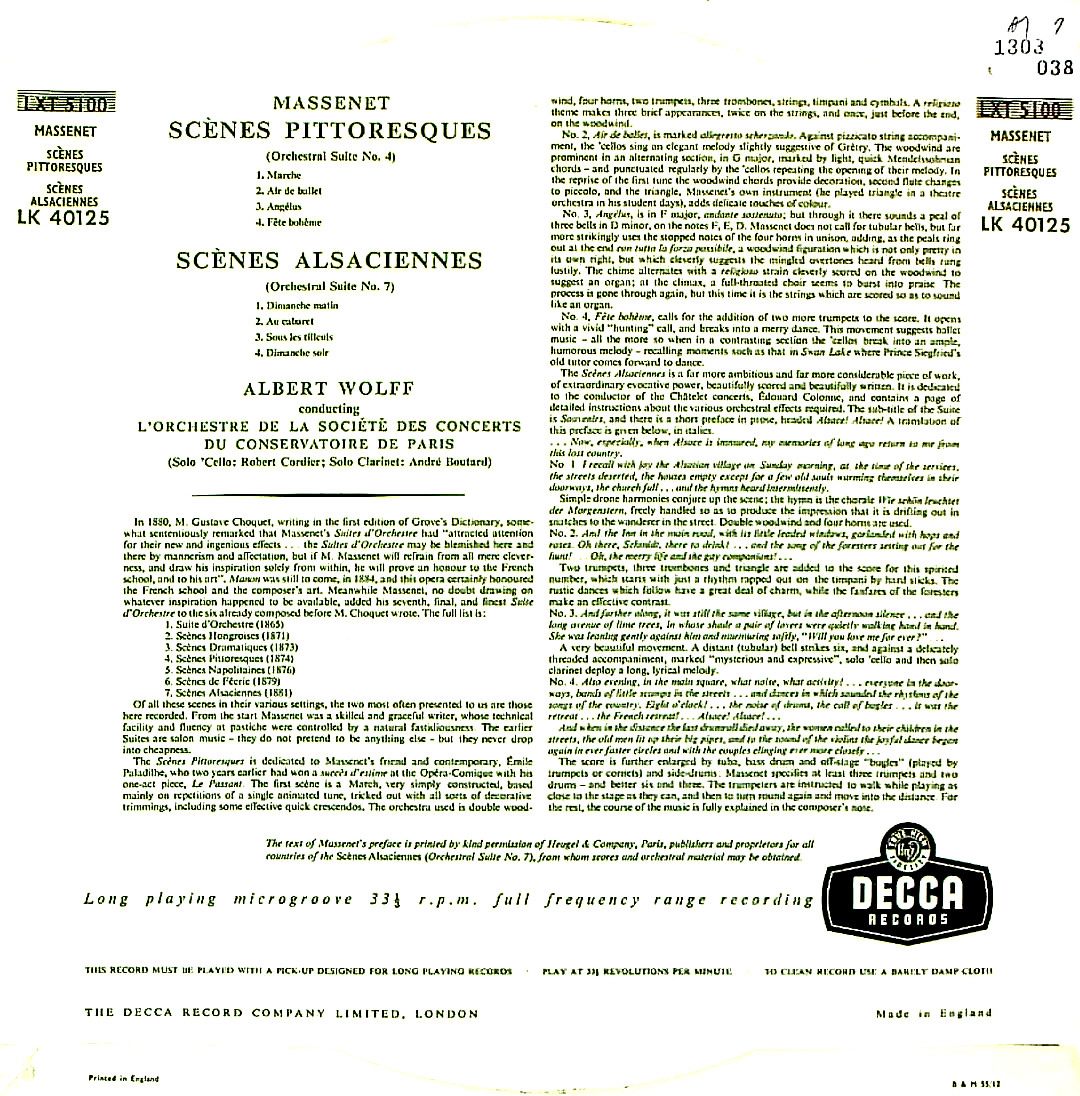 商品コード:1303-038[DECCA] A.ヴォルフ指揮パリ音楽院o. R.コルディエ(vc) A.ブ=タール(cl) / マスネ:組曲4番「絵のような風景」, 7番「アルザスの風景」