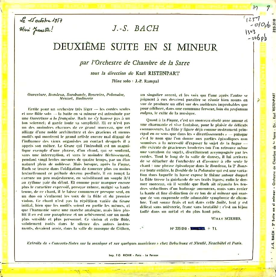 商品コード:1303-006pb[Les Discophiles Français] K.リステンパルト指揮ザール室内o. J.P.ランパル(fl) / バッハ:管弦楽組曲2番B.1067