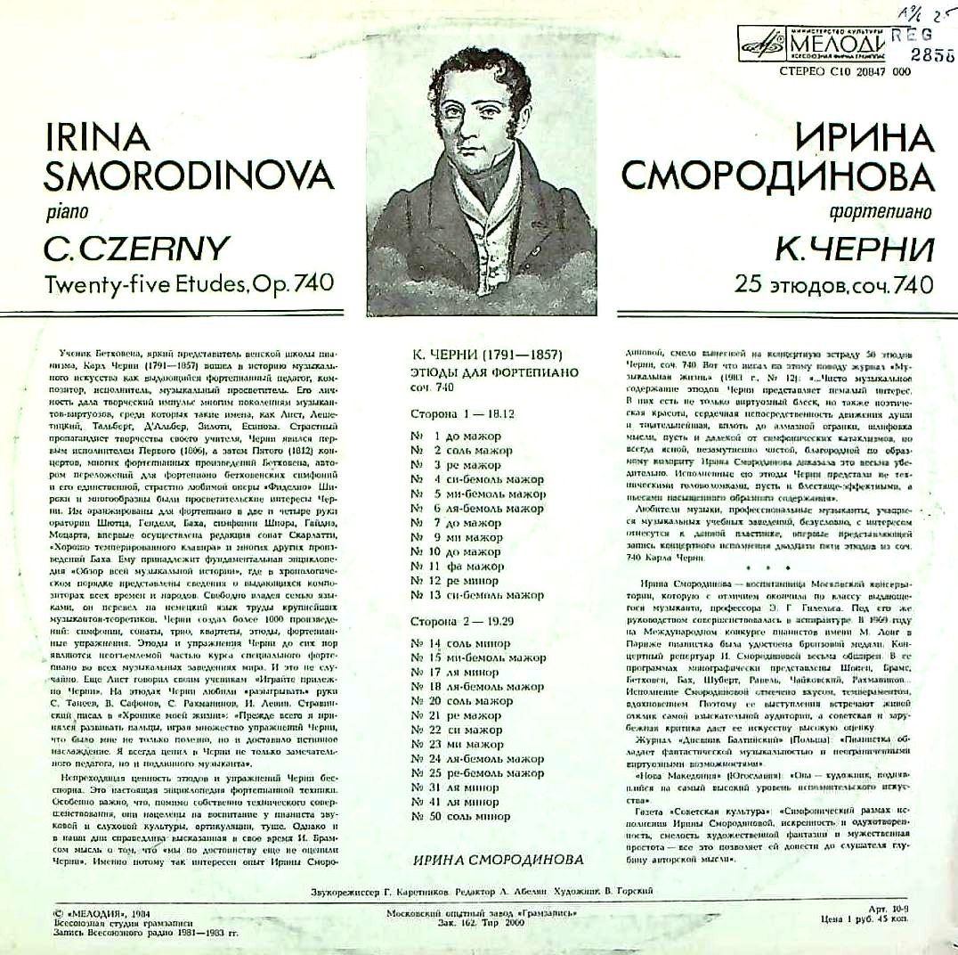 商品コード:REG-2858[露MELODIYA] I.スモロディノワ(pf) / チェルニー:50番練習曲Op.740(1~7, 9~15, 17~18, 20~25, 31, 41, 50番/抜粋25曲)
