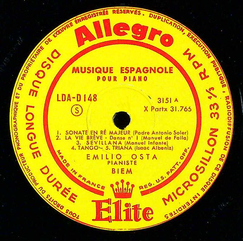 商品詳細:エミリオ・オスタ(Emilio Osta)に関する情報は殆どない。SP録音もあることから1900年以前にスペイン(バスク地方)で生まれたピアニストであろう。妻は有名なフラメンコ・ダンサーのテレシータ・オスタ( Teresita Osta.)である。1945年12月13日に夫婦でニューヨークのタイムズホールでスペインとラテンアメリカの作品の初の共同リサイタルを行ったという記事を見つけた。古い時期から米国に移住していた可能性が高い。恐らくその後、米国に帰化したと思われる。テレシータ・オスタは女優、ダンサーとして1942年封切りの米国映画「カピストラーノの鐘」に出演していることから、夫婦で米国での活動を行っていたようである。ALLEGRO以降は米VOXにも録音がある(Spain Marfer M. 50-217 S)。今となっては完全に忘れさられた音楽家だろう。ラローチャよリ前に米国へスペイン音楽を広めたピアニストがいたことを確認できた。オスタのピアノを聴いているとなんとなくホセ・イトゥルビを連想する。イトゥルビに通じるエンターテイメント性を感じる。当時の米国のショー・ビジネスの世界ではこのような分かりやすさこそ重要であったに違いない。本場のイベリアの空気より、楽しめる明るさで軽やかにスペインの旋律に馴染んでいただく。これがオスタの演奏から感じられる主張である。技巧は全面に出さず、スペイン音楽の楽しさを伝える使命を感じる。LPとしては音も良く、個性的な演奏でスーパーレア盤の大物ピアノLPである。