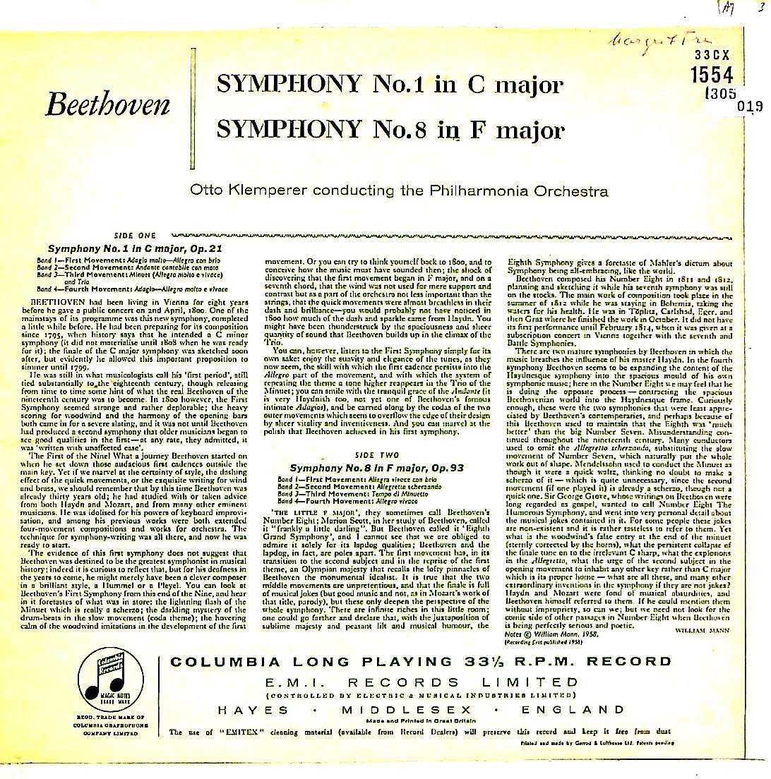 商品コード:1305-019n[COLUMBIA] O.クレンペラー指揮フィルハーモニアo. / ベートーヴェン:交響曲1番Op.21, 8番Op.93