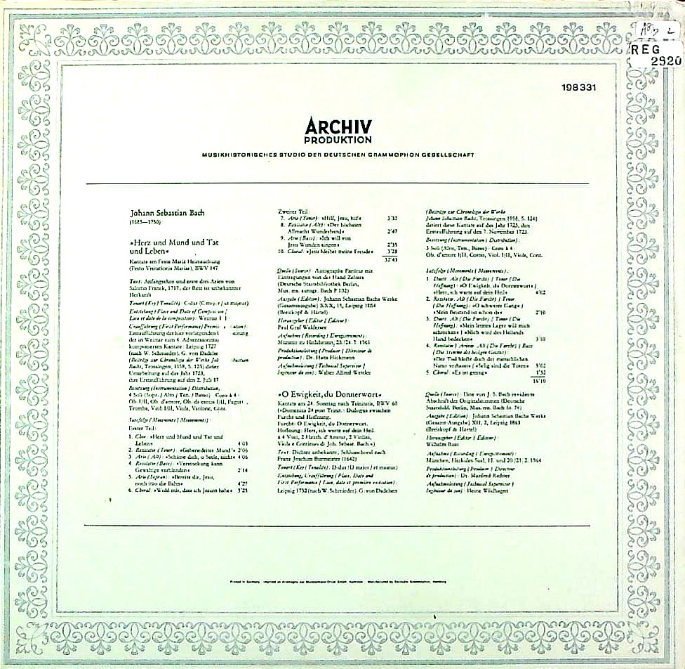 商品コード:REG-2920[独Archiv Produktion] K.リヒター指揮ミュンヘン・バッハo.cho. U.ブッケル(s)他 / バッハ:カンタータB.147, カンタータB.60