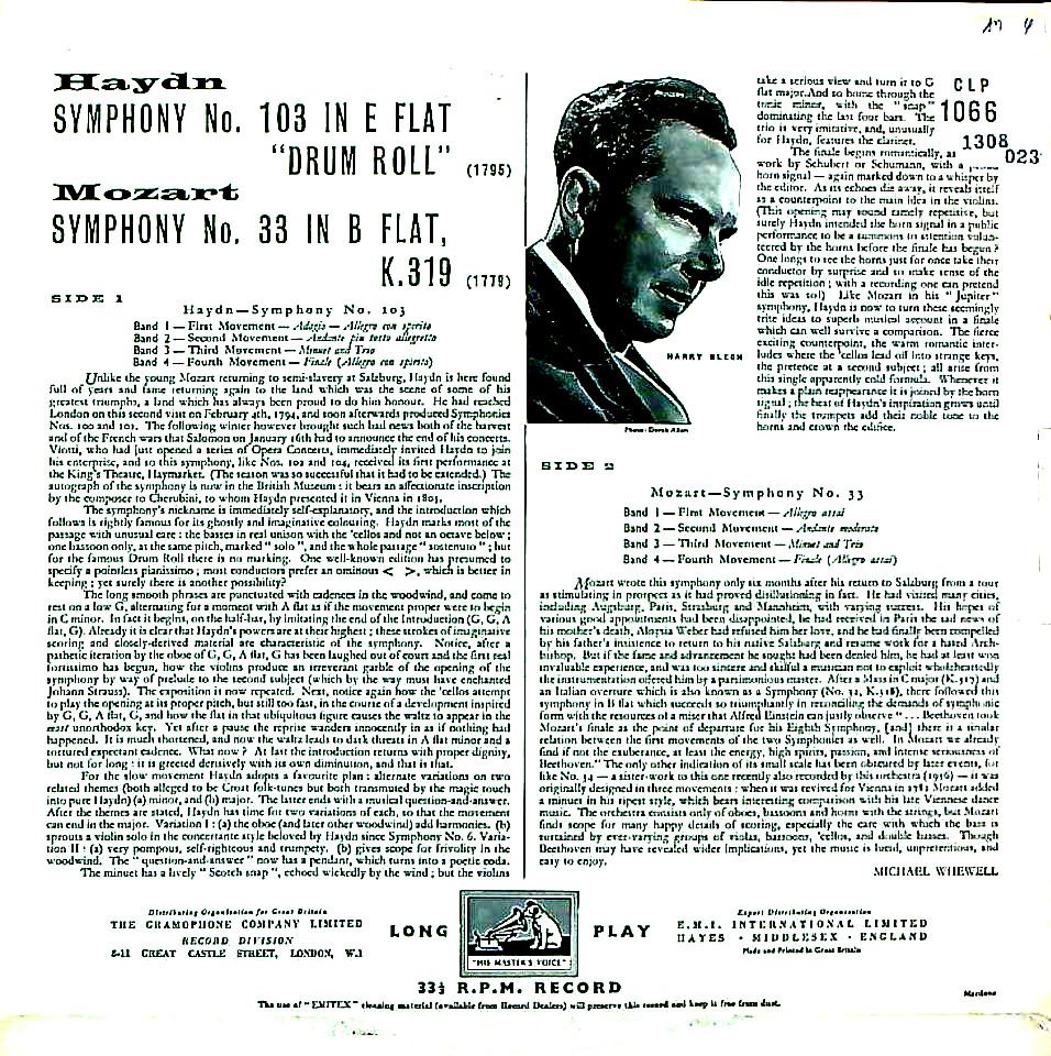 商品コード:1308-023n[His Master's Voice ] H.ブレック指揮ロンドン・モーツァルト・プレイヤーズ / モーツァルト:交響曲33番K.319, ハイドン:交響曲103番「太鼓連打」